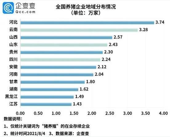 河北成全國(guó)養(yǎng)豬大省,云南、山西緊隨其后 地域上,河北省擁有的養(yǎng)豬企業(yè)數(shù)量最多,達(dá)3.74萬(wàn)家。河北省是生豬養(yǎng)殖和調(diào)出大省,存欄量和出欄量連續(xù)多年位居全國(guó)前列,是全國(guó)重要的生豬生產(chǎn)和供應(yīng)基地。河北還有個(gè)“全國(guó)養(yǎng)豬大縣”——安平縣。而云南省和山東省則分別以3.28萬(wàn)家和2.57萬(wàn)家養(yǎng)豬企業(yè),排名全國(guó)第二、第三。