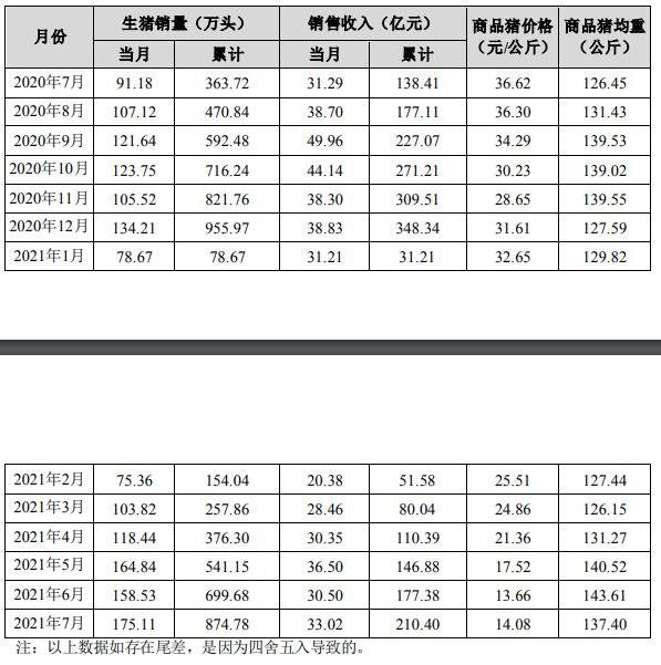 2021年1-7月,公司累計銷售生豬874.78萬頭,同比增長140.51%;累計銷售收入210.40億元,同比增長52.01%。