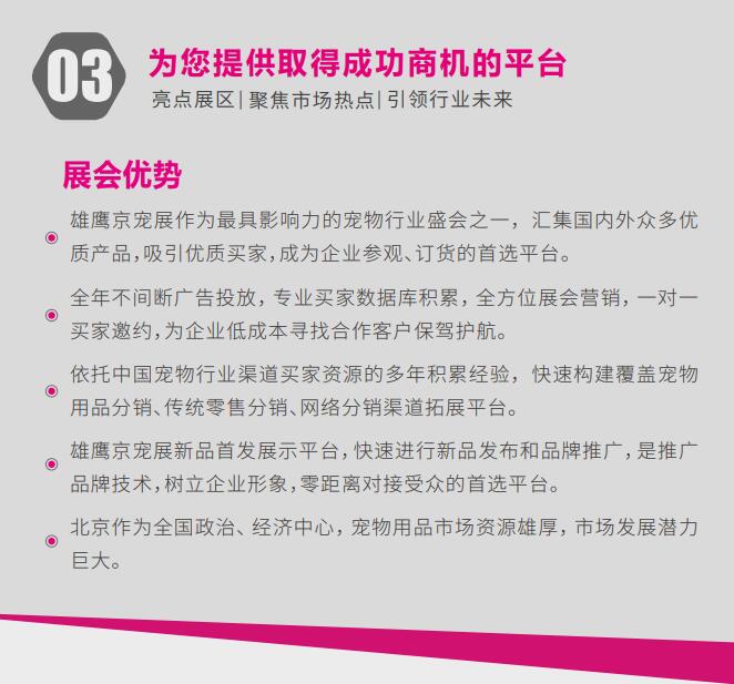 雄鷹京寵展匯聚全國行業(yè)精英,涵蓋國內(nèi)外的寵物用品全系列產(chǎn)品和前沿技術,是行業(yè)品牌推廣、新品發(fā)布、市場開拓、商務貿(mào)易、數(shù)據(jù)發(fā)布的專業(yè)化平臺,已成為行業(yè)發(fā)展趨勢的風向標。
