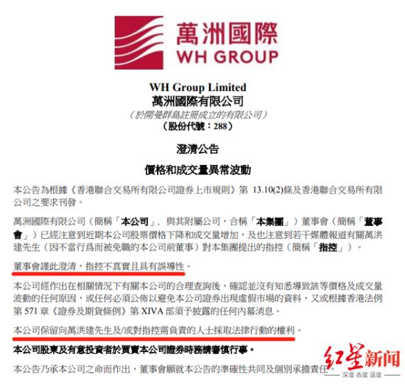 8月18日,萬洲國際(00288.HK)發(fā)布公告稱,其董事會已經(jīng)注意到近期公司股票價格下降和成交量增加,也注意到若干媒體報道有關(guān)萬洪建提出的指控。萬洲國際董事會澄清稱,萬洪建提出的指控不真實且具有誤導(dǎo)性?!氨竟颈A粝蛉f洪建先生及/或?qū)χ缚匦柝撠煹娜耸坎扇》尚袆拥臋?quán)利?!?br>