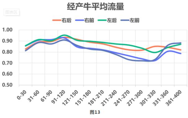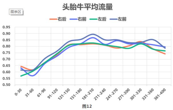 圖12所示為頭胎牛分乳區(qū)分階段的平均流量。頭胎牛在泌乳初期時平均流量較低,可能因為頭胎牛第一次進入泌乳階段,還沒完全適應擠奶過程,但是隨著產(chǎn)奶量逐漸增加、泌乳天數(shù)逐漸增加的過程,各個乳區(qū)的平均流量也在逐漸增加,能夠達到0.8公斤/分鐘以上,同時可見前乳區(qū)平均流量要高于后乳區(qū)。
