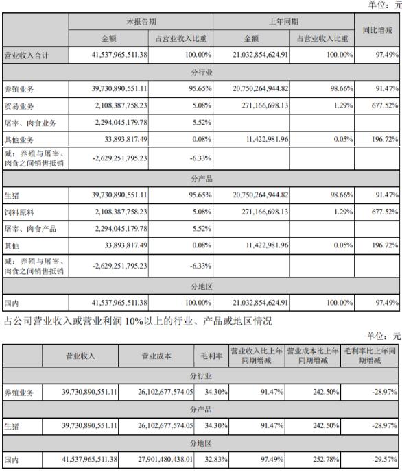 報(bào)告期內(nèi),公司銷售生豬1,743.7萬頭(其中向牧原肉食品有限公司及其子公司銷售98.2萬頭),其中商品豬1,469.6萬頭、仔豬252.2萬頭、種豬21.9萬頭;公司共計(jì)屠宰生豬98.12萬頭,完成鮮、凍品豬肉銷售9.72萬噸,屠宰業(yè)務(wù)實(shí)現(xiàn)營業(yè)收入22.94億元。
