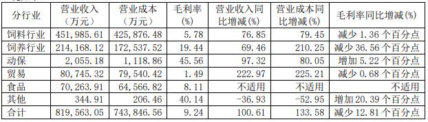 報(bào)告期內(nèi),公司的營(yíng)業(yè)收入主要由飼料業(yè)務(wù)及生豬養(yǎng)殖業(yè)務(wù)收入構(gòu)成,飼料及養(yǎng)殖業(yè)務(wù)收入合計(jì)為666,153.73萬(wàn)元,占主營(yíng)業(yè)務(wù)收入的比例為81.28%。報(bào)告期內(nèi),公司主營(yíng)業(yè)務(wù)分行業(yè)情況如下: