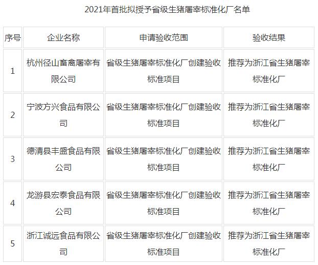 浙江公布2021年首批擬授予省級(jí)生豬屠宰標(biāo)準(zhǔn)化廠名單