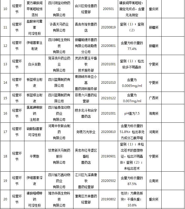 為加強獸藥質量監(jiān)管,保障養(yǎng)殖環(huán)節(jié)用藥安全,根據全國獸藥質量監(jiān)督抽檢計劃,我部組織對全國獸藥生產、經營和使用單位進行了獸藥質量監(jiān)督抽檢?,F(xiàn)將有關情況通報如下。