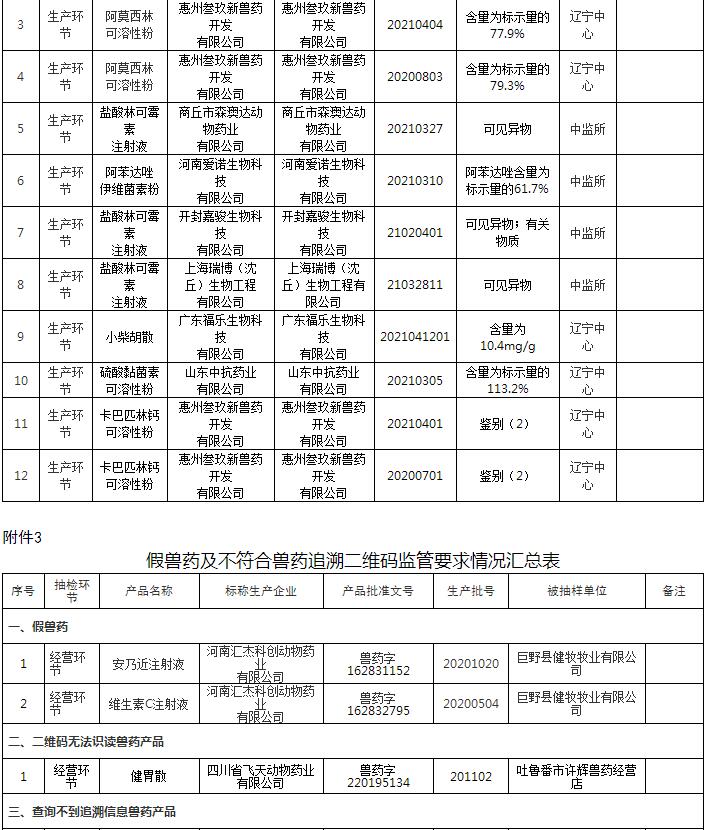2021年第二季度監(jiān)督抽檢中發(fā)現(xiàn)假獸藥2批和不符合獸藥追溯二維碼監(jiān)管要求的獸藥產品3批(見附件3)。