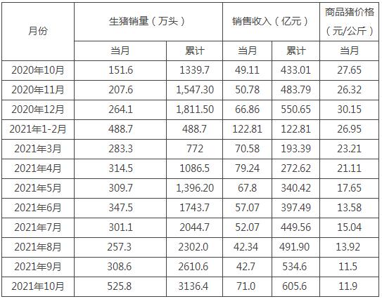 2021年10月份,公司商品豬銷售均價(jià)11.88元/公斤,比2021年9月份上升3.39%。