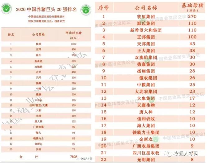 本次排名,前22強(qiáng)分別是:牧原、溫氏、新希望六和、正邦、天邦、正大、雙胞胎、德康、揚(yáng)翔、傲農(nóng)、中糧、大北農(nóng)、大象集團(tuán)、天康生物、唐人神、佳和農(nóng)牧、海大集團(tuán)、鐵騎力士、金新農(nóng)、廣西農(nóng)墾、巨星農(nóng)牧、光明集團(tuán)。
