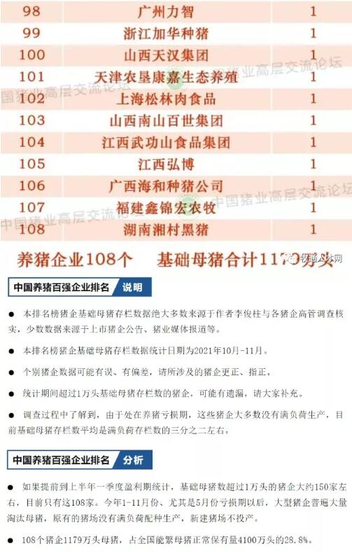 排名顯示,超過1萬頭的豬企大約150家左右,排名只統(tǒng)計(jì)到了108家。排名調(diào)查過程中了解到,由于處在養(yǎng)豬虧損期,這些豬企大多數(shù)沒有滿負(fù)荷生產(chǎn),目前基礎(chǔ)母豬存欄數(shù)平均是滿負(fù)荷存欄數(shù)的三分之二左右。