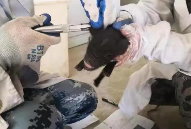 圖為工作人員給仔豬打耳缺編號(hào)。(受訪者供圖)