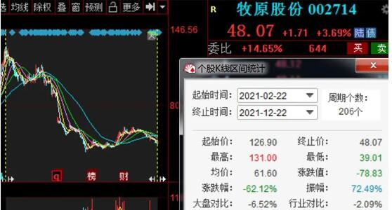 今年以來,牧原股份股價(jià)波動劇烈,截至22日收盤,公司股價(jià)為48.07元,較年初131元/股的高位已跌超60%。