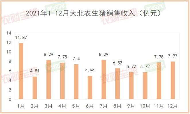 從往年數(shù)據(jù)來看,養(yǎng)豬業(yè)務(wù)是大北農(nóng)第二大收入來源。2021年,大北農(nóng)累計生豬銷售收入 87.06億元,同比增長 23.89%。具體來看,得益于年初較高的豬價,一月份大北農(nóng)取得了全年最高的賣豬收入11.87億元。到了下半年,依靠穩(wěn)定的出欄量和逐步回升的豬價,大北農(nóng)在第四季度取得了21.47億元生豬銷售收入。