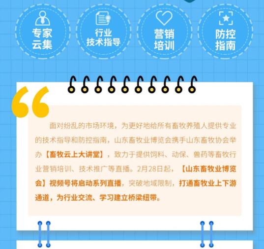 為更好地利用互聯(lián)網(wǎng)+的傳播手段,傳授應(yīng)對(duì)市場(chǎng)變化所產(chǎn)生的影響,推廣先進(jìn)的疾病防控和降本增效經(jīng)驗(yàn),山東畜牧業(yè)博覽會(huì)攜手山東省畜牧協(xié)會(huì)推出“畜牧云上大講堂”活動(dòng)?;顒?dòng)誠(chéng)邀國(guó)內(nèi)頂尖專家、教授,以及行業(yè)主管部門領(lǐng)導(dǎo)、龍頭企業(yè)大咖做客,與廣大畜牧人互動(dòng)交流,分享飼料、動(dòng)保、獸藥等畜牧行業(yè)知識(shí)。