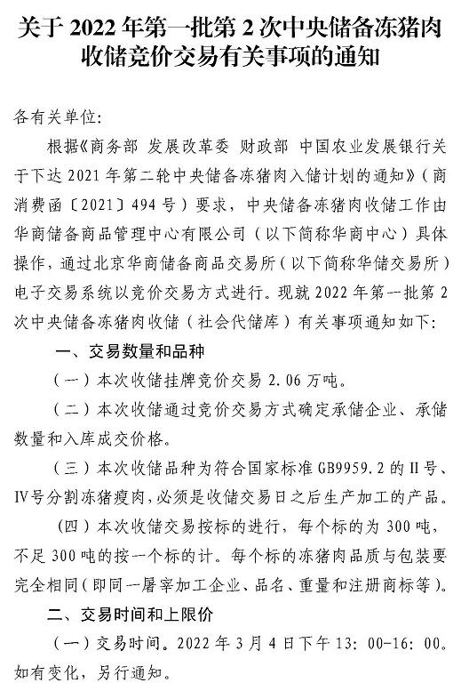 華儲(chǔ)網(wǎng):2022年第一輪第2次中央儲(chǔ)備凍豬肉收儲(chǔ)競價(jià)交易2.06萬噸