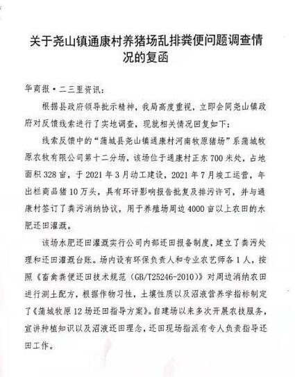 3月3日,蒲城縣農(nóng)業(yè)農(nóng)村局、蒲城縣堯山鎮(zhèn)人民政府回函稱,“蒲城縣堯山鎮(zhèn)通康村河南牧原豬場”系蒲城牧原農(nóng)牧有限公司第十二分場,經(jīng)走訪了解,未發(fā)現(xiàn)該場有亂排豬糞造成農(nóng)作物損害及污染環(huán)境的問題。