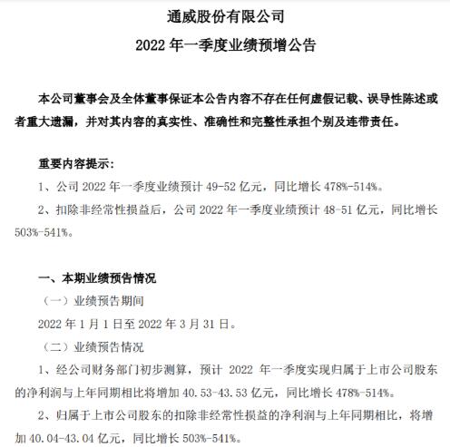 同比環(huán)比雙雙翻倍!通威股份2022年一季度預計盈利52億元