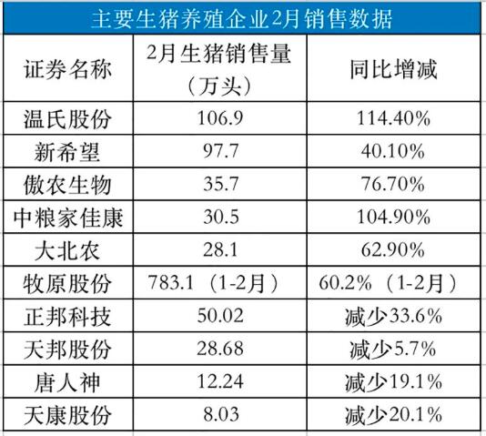 數(shù)據(jù)顯示,溫氏股份、新希望、傲農(nóng)生物、中糧家佳康、大北農(nóng)等企業(yè)2月出欄量同比正增長。其中,溫氏股份出欄106.9萬頭,同比增長114.4%;新希望出欄97.7萬頭,同比增長40.1%;傲農(nóng)生物出欄35.7萬頭,同比增長76.7%;中糧家佳康出欄30.5萬頭,同比增長104.9%;大北農(nóng)出欄28.1萬頭,同比增長62.9%。另外,牧原股份1月-2月出欄量為783.1萬頭,同比增長60.2%。