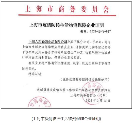 3月15日,一封由上海市新冠肺炎疫情防控工作領(lǐng)導(dǎo)小組辦公室物資保障組和上海市商務(wù)委聯(lián)合作出的《上海市疫情防控生活物資保障企業(yè)證明》,送達上海六和勤強食品有限公司,這意味著勤強正式入選上海疫情防控供應(yīng)企業(yè)名單,成為上海市重點民生保供企業(yè)。