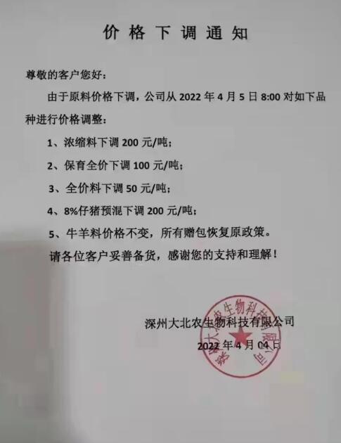 深州大北農(nóng)生物科技有限公司:4月5日起,濃縮料下調(diào)200元/噸,保育全價下調(diào)100元/噸,全價料下調(diào)50元/噸,8%仔豬預(yù)混下調(diào)200元/噸;