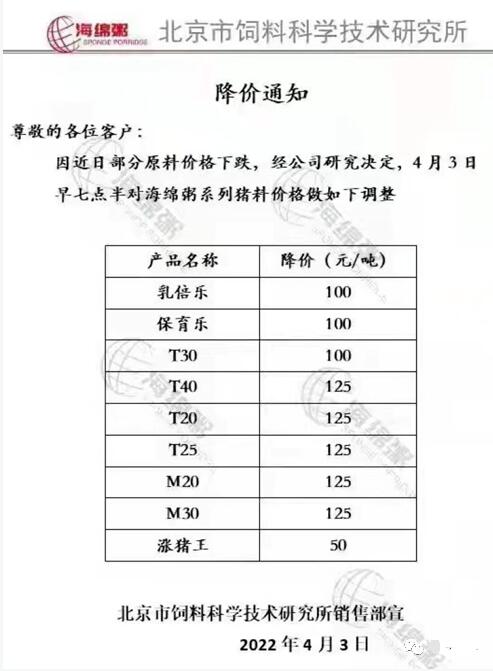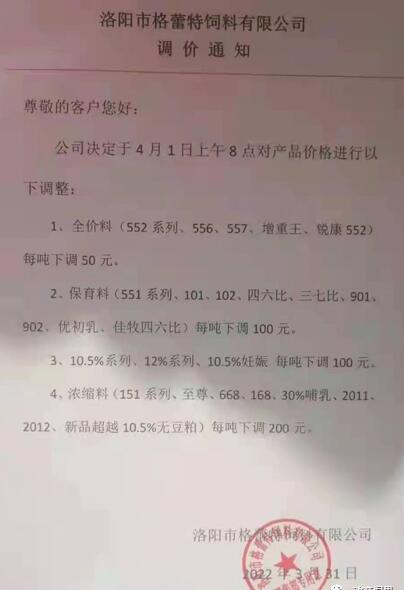 洛陽格蕾特飼料有限公司:4月1日起,全價料下調(diào)50元/噸,保育料下調(diào)100元/噸,濃縮料下調(diào)200元/噸;