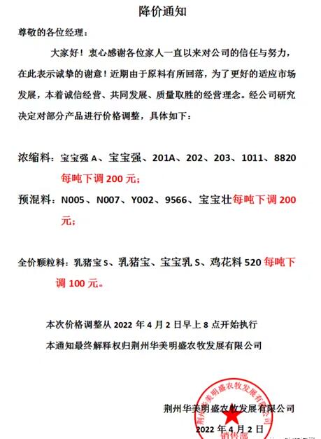 荊州華美明盛農(nóng)牧發(fā)展有限公司:4月2日起,濃縮料下調(diào)200元/噸,預(yù)混料下調(diào)200元/噸,全價顆粒料下調(diào)100元/噸;
