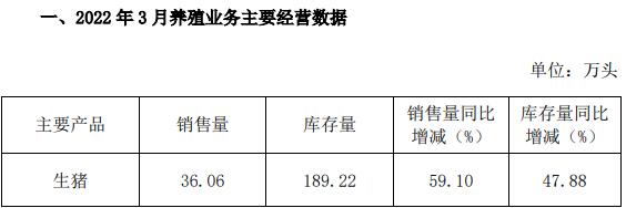2022年3月,公司生豬銷售量36.06萬頭,銷售量環(huán)比增長18.10%,同比增長59.10%。