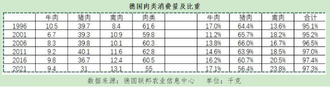 以德國(guó)為例,從肉類(lèi)消費(fèi)歷史趨勢(shì)來(lái)看,2011年以后肉類(lèi)消費(fèi)量總體趨降,豬肉占比下降。2011年,豬肉、禽肉、牛肉在肉類(lèi)消費(fèi)中所占比例,分別為63.9%、18.5%、14.6%。10年后,由于人均肉類(lèi)消費(fèi)需求下降,導(dǎo)致2021年豬肉產(chǎn)量減少2.4%,牛肉和禽肉產(chǎn)量下降1.6%。三種肉類(lèi)所占比例,分別為56.4%、23.8%、17.1%。