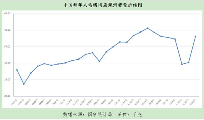 然而,從2015年開(kāi)始,受?chē)?guó)內(nèi)產(chǎn)量下降、肉類(lèi)消費(fèi)結(jié)構(gòu)調(diào)整優(yōu)化以及國(guó)家限制“三公”消費(fèi)等多重因素的影響,指標(biāo)開(kāi)始下降。從2015年至2018年,總體在40千克上下波動(dòng)。2019年,受非洲豬瘟疫情影響,驟降至31.7千克。2020年,回升至32.2千克,同比增長(zhǎng)1.58%。2021年,隨著產(chǎn)能恢復(fù)和消費(fèi)需求增長(zhǎng),達(dá)到40.1千克。