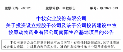 4月11日,中牧股份發(fā)布公告,中牧股份、中牧南京動物藥業(yè)有限公司擬與牧原食品股份有限公司共同出資設立中牧牧原。