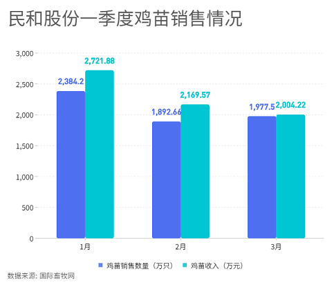 由于行情不景氣,民和雞苗收入受到很大影響。民和股份4月8日晚間公告,公司2022年3月銷(xiāo)售商品代雞苗1,977.50萬(wàn)只,同比變動(dòng)-36.75%,環(huán)比變動(dòng)4.48%;銷(xiāo)售收入2004.22萬(wàn)元,同比變動(dòng)-86.99%,環(huán)比變動(dòng)-7.62%。
