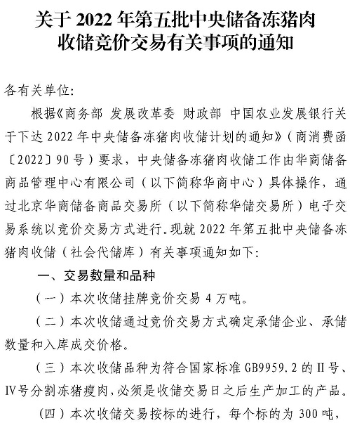 華儲(chǔ)網(wǎng):2022年第四批中央儲(chǔ)備凍豬肉收儲(chǔ)競(jìng)價(jià)交易4萬(wàn)噸