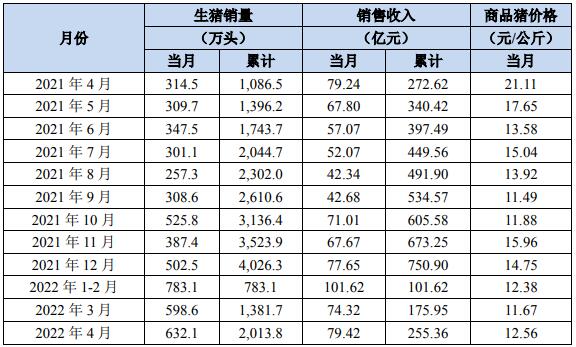2022年4月份,公司銷售生豬632.1萬頭(其中仔豬銷售101.9萬頭),銷售收入79.42億元。其中向全資子公司牧原肉食品有限公司及其子公司合計(jì)銷售生豬70.55萬頭。
