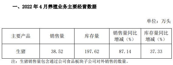 2022年4月,公司生豬銷售量38.52萬頭,銷售量環(huán)比增長6.83%,同比增長87.14%。