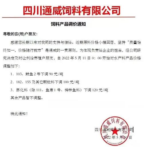 四川通威飼料降價(jià)了