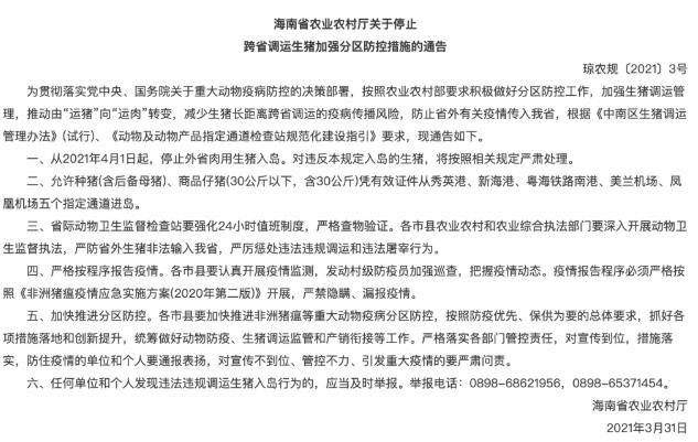 海南省農(nóng)業(yè)農(nóng)村廳早在2021年3月31日就發(fā)布《海南省農(nóng)業(yè)農(nóng)村廳關(guān)于停止跨省調(diào)運(yùn)生豬加強(qiáng)分區(qū)防控措施的通告》,《通告》表示,2021年4月1日起,停止外省肉用生豬入島。