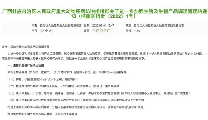 今年3月1日,廣西壯族自治區(qū)人民政府重大動(dòng)物疫病防治指揮部就發(fā)布了《廣西壯族自治區(qū)人民政府重大動(dòng)物疫病防治指揮部關(guān)于進(jìn)一步加強(qiáng)生豬及生豬產(chǎn)品調(diào)運(yùn)管理的通知(桂重防指發(fā)〔2022〕1號(hào))》,禁止外省生豬調(diào)入(種豬、仔豬等其他情形例外)。
