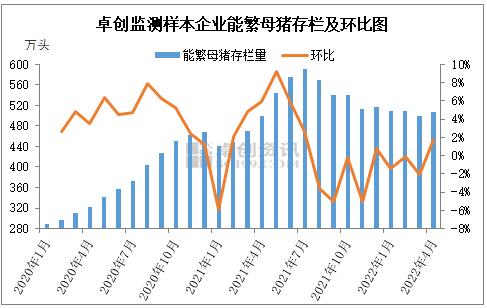 據(jù)涌益咨詢數(shù)據(jù),4月份樣本點(diǎn)能繁母豬存欄環(huán)比下降0.13%,但集團(tuán)場(chǎng)環(huán)比增加3.8%。4月份,30強(qiáng)豬企能繁母豬存欄量940.5萬頭,占全國(guó)能繁母豬總量的22.5%,集中度比2021年末提高0.9%。