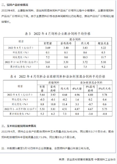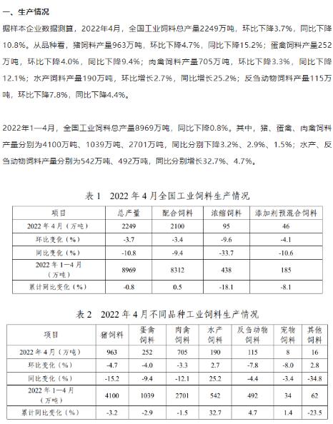 中國飼料工業(yè)協(xié)會(huì)20日發(fā)布數(shù)據(jù)顯示,據(jù)樣本企業(yè)數(shù)據(jù)測算,2022年4月,全國工業(yè)飼料總產(chǎn)量2249萬噸,環(huán)比下降3.7%,同比下降10.8%。