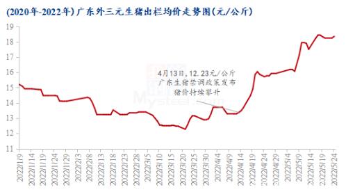 海闊憑魚躍,天高任鳥飛。自新一輪的廣東生豬禁調(diào)政策發(fā)布以來(lái),廣東豬價(jià)如脫韁的野馬一般一路前行,據(jù)Mysteel農(nóng)產(chǎn)品數(shù)據(jù)統(tǒng)計(jì),截止2022年5月24日廣東外三元生豬出欄均價(jià)為18.40元/公斤,較4月13日累計(jì)上漲5.03元/公斤,漲幅37.45%。在政策落地近一個(gè)月的當(dāng)下,豬價(jià)上漲勢(shì)頭開始趨緩,難道此次新政又是雷聲大雨點(diǎn)小?不久的將來(lái)又要打回原形?廣東豬價(jià)高點(diǎn)到底在什么位置?