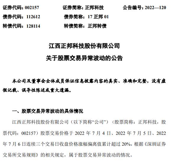 正邦科技7月6日公告, 公司股票交易價(jià)格于2022年7月4日、2022年7月5日、2022年7月6日連續(xù)三個(gè)交易日收盤價(jià)格漲幅偏離值累計(jì)超過(guò)20%,根據(jù)《深圳證券交易所交易規(guī)則》的相關(guān)規(guī)定,屬于股票交易異常波動(dòng)的情況。