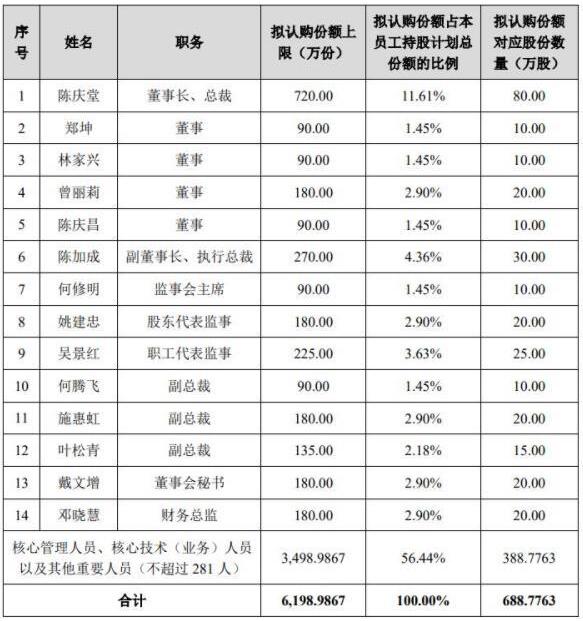 《計劃》介紹,參與對象為對公司整體業(yè)績和中長期發(fā)展具有重要作用和影響的公司(含控股子公司,下同)董事(不含獨立董事)、監(jiān)事、高級管理人員、核心管理人員、核心技術(shù)(業(yè)務(wù))人員以及其他重要人員等,總計不超過295人,其中董事(不含獨立董事)、監(jiān)事、高級管理人員合計14人。持有人名單及份額分配情況如下圖所示: