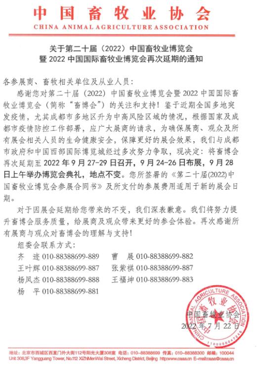 7月22日,中國(guó)畜牧業(yè)協(xié)會(huì)發(fā)布通知,第二十屆(2022)中國(guó)畜牧業(yè)博覽會(huì)暨2022中國(guó)國(guó)際畜牧業(yè)博覽會(huì)延期至9月27-29日召開。