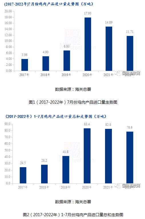 據(jù)海關(guān)總署數(shù)據(jù)統(tǒng)計,2022年7月份雞肉產(chǎn)品進口量達11.71萬噸,環(huán)比跌幅0.09%,同比跌幅21.37%。今年以來,雞肉進口方面受到國際上禽流感肆虐、全球新冠疫情的持續(xù)影響、國際形勢波動等影響,一直處于弱勢運行的局面。從圖一和圖二可以看出,不管是近6年(2017-2022年)7月份單月的雞肉進口量,還是近6年(2017-2022年)1-7月同期的進口量總和來看,今年的雞肉進口方面均呈現(xiàn)出相對前兩年進口減量的局面。