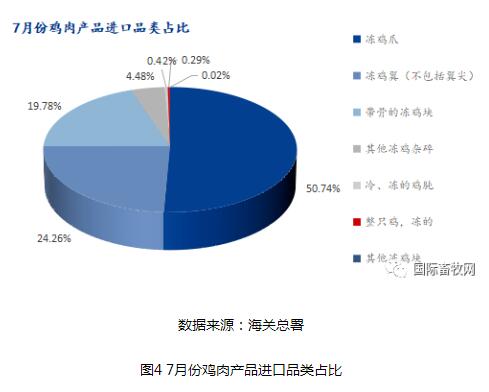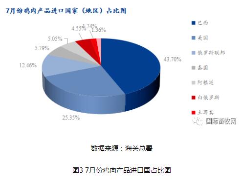 從雞肉產(chǎn)品進口國占比分布來看,巴西(5.12萬噸)、美國(2.97萬噸)、俄羅斯(1.46萬噸)、泰國(6.78萬噸)、阿根廷(5.92萬噸)為我國7月份雞肉產(chǎn)品進口量占比前5的國家,分別占比43.70%、25.35%、12.46%、5.79%和5.05%(如圖3)。美國的進口占比相對于今年4、5、6月的33.97%、30.06%、26.35%,呈現(xiàn)出占比持續(xù)下降的趨勢,國際面上禽流感和國際局勢影響不可忽視。