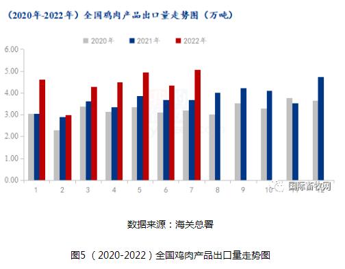 雞肉產(chǎn)品出口量方面,2022年7月份雞肉產(chǎn)品出口量高達5.07萬噸,環(huán)比漲幅16.55%,同比漲幅37.93%。值得注意的是,今年7月份的雞肉產(chǎn)品出口量突破單月5萬噸的層級,已經(jīng)創(chuàng)下近六年(2017-2022)的單月出口量新高,且1-7月份總出口合計30.77萬噸,同比漲幅27.55%,同樣是近六年的最高值。如圖5可見,2022年月度出口量均處于3年來的最高位。