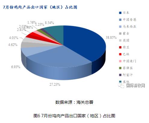 雞肉產(chǎn)品出口國(地區(qū))占比方面,7月份出口雞肉產(chǎn)品共涉及41個國家或地區(qū),日本占比最大,7月份出口日本1.97萬噸,占比38.85%;出口中國香港1.38萬噸,占比27.23%;出口馬來西亞0.35萬噸,占比6.93%。今年國內(nèi)雞肉產(chǎn)品出口量增加明顯,東亞和東南亞為我國雞肉產(chǎn)品出口主銷區(qū)。