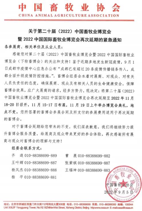 畜博會(huì)組委會(huì)本著對展商、對觀眾、對有關(guān)人員負(fù)責(zé)人的態(tài)度,確保展商、觀眾及有相關(guān)人員的生命健康安全,保障畜博會(huì)效果,應(yīng)廣大展商的請求,經(jīng)多方努力,現(xiàn)決定將第二十屆(2022)中國畜牧業(yè)博覽會(huì)暨2022中國國際畜牧業(yè)博覽會(huì)再次延期至2022年11月18-20日召開,11月15-17日布展,11月19日上午舉辦博覽會(huì)典禮。