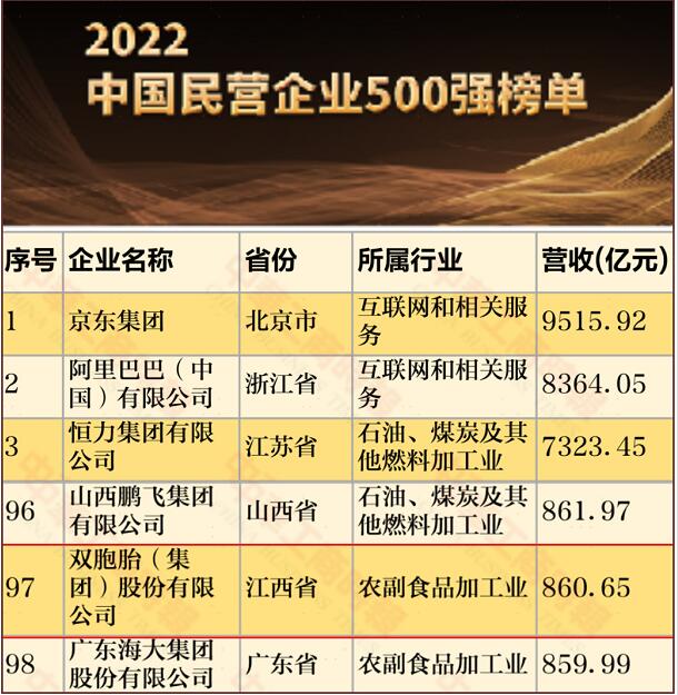 全國(guó)工商聯(lián)發(fā)布2022中國(guó)民營(yíng)企業(yè)500強(qiáng)榜單,雙胞胎集團(tuán)位列第97名