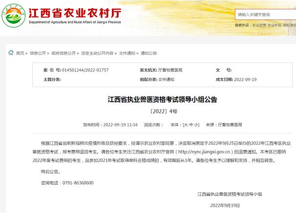 江西省農(nóng)業(yè)農(nóng)村廳網(wǎng)站9月19日消息,根據(jù)江西省當(dāng)前新冠肺炎疫情形勢及防控要求,經(jīng)請示農(nóng)業(yè)農(nóng)村部同意,決定取消原定于2022年9月25日舉辦的2022年江西考區(qū)執(zhí)業(yè)獸醫(yī)資格考試,報考費用退回考生。