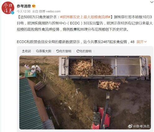 另據(jù)參考消息,歐洲疾病預(yù)防與控制中心(ECDC)10月3日發(fā)出警告,歐洲正在經(jīng)歷有記錄以來最大規(guī)模的高致病性禽流感疫情,病例數(shù)量和地理分布范圍都創(chuàng)下歷史紀(jì)錄。